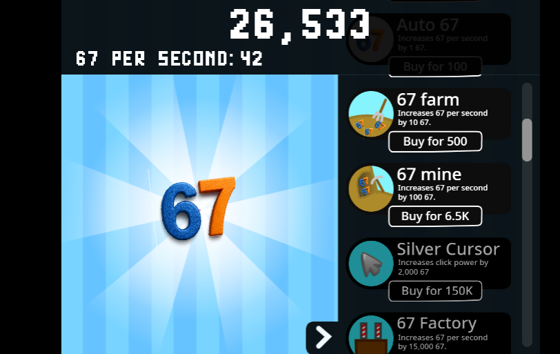 In 67 Clicker, the primary objective is to click the screen or mouse to augment a number that signifies the player's advancement. Each click accrues points, and as the total increases, players may unlock enhancements that facilitate accelerated point accumulation. Certain enhancements enable the number to escalate autonomously without user interaction, categorizing the game as an idle game.This indicates that players may continue to advance even in their absence from active gameplay.