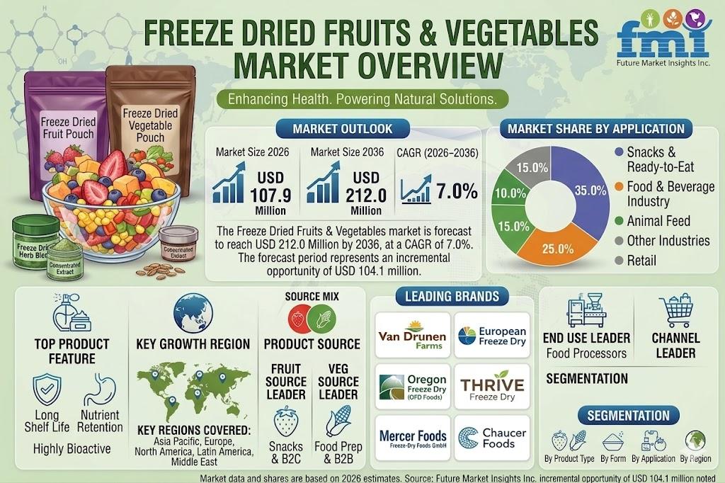 NEWARK, Del., USA | April 21, 2026 — According to the latest analysis by Future Market Insights (FMI), the global freeze dried fruits & vegetables market is poised for strong expansion, driven by rising demand for shelf-stable, nutrient-preserving food ingredients and increasing adoption across snacks, cereals, and functional nutrition segments. The market is valued at USD 108.0 billion in 2026 and is projected to reach USD 212.0 billion by 2036, registering a CAGR of 7.0%. The sector is expected to generate an incremental opportunity of USD 104.0 billion over the forecast period.