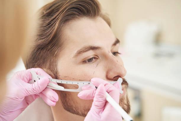 The specialist studies jawline shape, cheek structure, and natural hair growth pattern.
