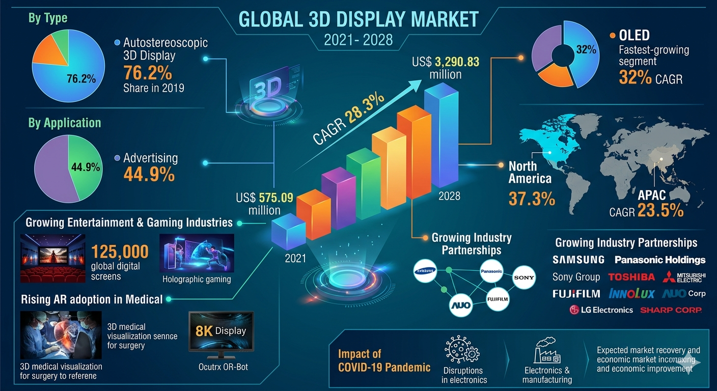 The 3D Display Market Outlook is witnessing significant growth driven by increasing demand for immersive visualization across diverse application areas. The market was valued at US$ 575.09 million in 2021 and is projected to reach US$ 3,290.83 million by 2028, registering a strong CAGR of 28.3% during the forecast period from 2021 to 2028. This growth is supported by rising investments in advanced display technologies, expanding use of 3D visualization systems across industries, and continuous improvements in display performance and quality.
