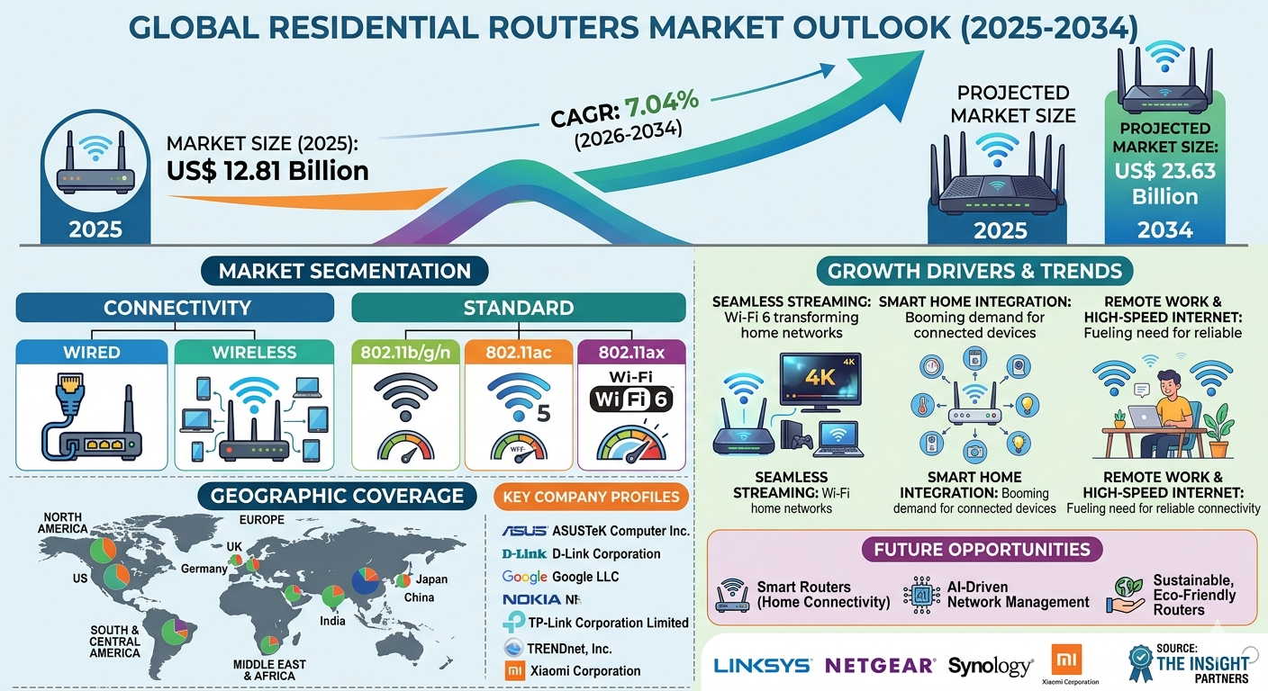 At the core of this evolution is the Residential Routers Market Forecast, which is projected to grow from US$ 12.81 billion in 2025 to US$ 23.63 billion by 2034, registering a CAGR of 7.04% during the forecast period from 2026 to 2034. This growth is supported by rising internet penetration, increasing adoption of smart devices, and the growing demand for high-performance networking solutions that offer enhanced speed, coverage, and security across residential environments globally.