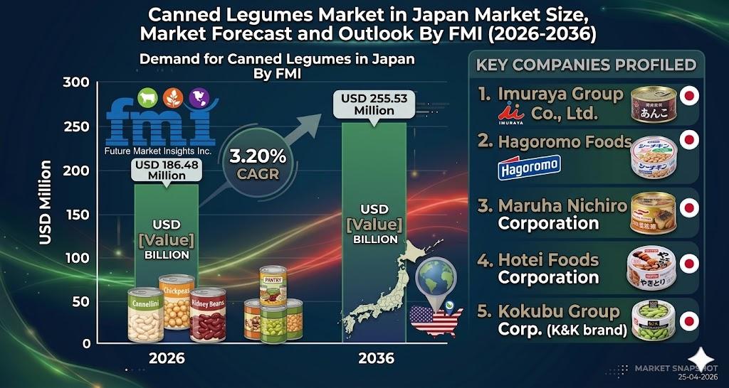 NEWARK, Del., USA | April 24, 2026 — According to Future Market Insights (FMI), the demand for canned legumes in Japan is projected to grow from USD 186.48 million in 2026 to USD 255.53 million by 2036, registering a CAGR of 3.20%. Growth is being driven by increasing urbanization, an aging population, and rising preference for convenient, protein-rich, shelf-stable food solutions.