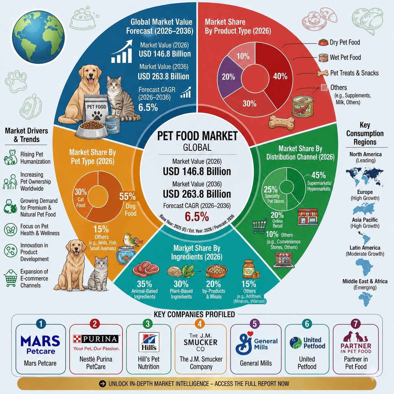 NEWARK, Del., USA | April 27, 2026 — According to Future Market Insights (FMI), the global pet food market is projected to grow from USD 141.0 million in 2026 to USD 263.8 million by 2036, registering a CAGR of 6.5% during the forecast period. Growth is being driven by rising pet ownership, increasing humanization of pets, and strong demand for premium, functional, and condition-specific nutrition products.